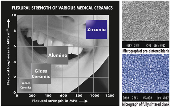 Populairement connu sous le nom d' "acier céramique", le zircone (ZrO2) ou l'oxyde de zirconium est un minéral inorganique non métallique appartenant au groupe des céramiques d'oxyde. Il peut être partiellement stabilisé par l'yttrium et enrichi en aluminium pour améliorer ses propriétés structurelles. Le zircone possède une résistance à la flexion, une dureté et une ténacité élevées. Sa combinaison unique d'excellentes propriétés mécaniques et chimiques en fait un biomatériau idéal. Il peut également être collé avec du métal pour former une couronne céramique-métal. Les restaurations à base de zircone sont très polyvalentes et peuvent être utilisées pour les couronnes, les bridges et les piliers implantaires dans diverses situations cliniques. La haute résistance et l'esthétique élevée du zircone en font une excellente option pour les restaurations dentaires et les implants.